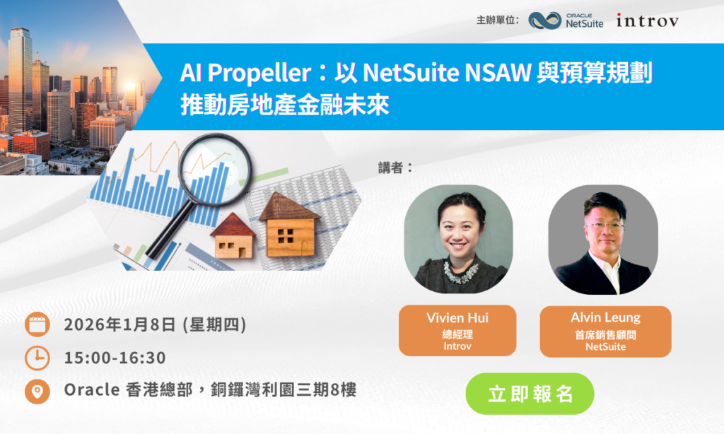 誠邀您蒞臨 Oracle 香港總部,參加由 Oracle NetSuite 與 Introv 合辦的專屬研討會。活動將展示如何透過 NetSuite Analytics Warehouse (NSAW) 及 Planning & Budgeting (NSPB) 提供即時財務可視化與智慧預測,同時介紹 Introv 的 AI Propeller 解決方案,為房地產行業量身打造雲端業務管理平台,從租約管理到財務表現全面自動化。