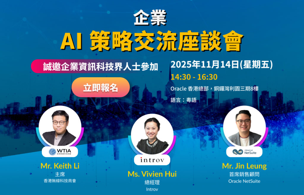 誠邀您參加在 Oracle 香港總部舉辦的獨家企業AI策略研討會,由 Oracle NetSuite、Introv 及香港無線科技商會 (WTIA) 聯合主辦,共同探討 AI 如何重塑企業策略、運營及創新。